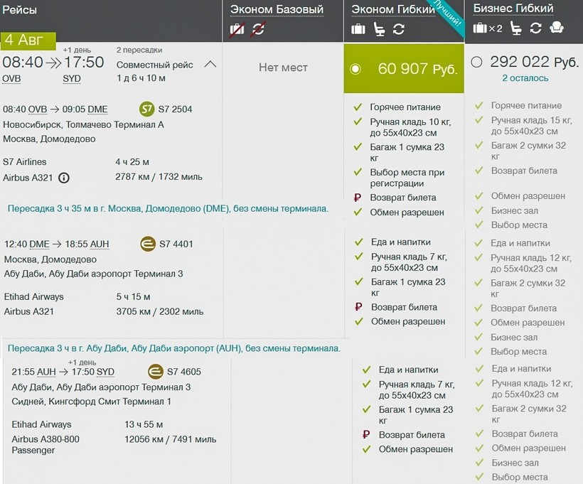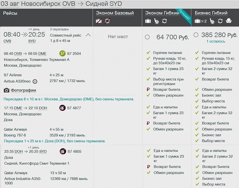 У S7 и Qatar также удобное расписание полетов — рейсы выполняются ежедневно. С восьмичасовой (или пятичасовой) пересадкой в Москве и полуторачасовой — в Дохе авиаперелет длится 33 ч. (30 ч.). Билеты у S7 и Qatar немного дороже, чем у S7 и Etihad: туда с багажом обойдутся от 64700 ₽, если приобрести и на обратную дорогу, это будет стоить от 99000 ₽. Бизнес-класс — от 385000 ₽. Тариф с ручной кладью у данных авиакомпаний недоступен.