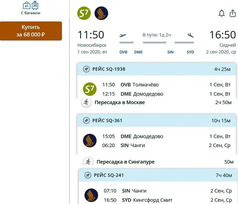 Самолеты S7 и Singapore Airlines летают во все дни недели, кроме среды и воскресенья. Данные операторы немного выигрывают у предыдущих авиакомпаний по продолжительности полета — со стыковками в 3 ч. в Москве и 1 ч. (3 ч.) в Сингапуре путешествие занимает 26 ч. (28,5 ч.). Могу рекомендовать перелет с S7 и «Сингапурскими авиалиниями» в исключительных случаях, потому что он получается немного дороже, чем вышеописанные варианты с двумя пересадками: билеты с багажом туда стоят от 68000 ₽, в обе стороны — от 102000 ₽. Бизнес-класс — от 295000 ₽.