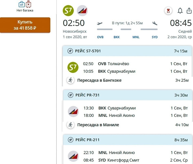 Учитывая большое расстояние между российским и австралийским городами, очень дешевые авиабилеты по направлению не предлагает ни одна из компаний. Но туристам, которые путешествуют только с ручной кладью, могу рекомендовать рейсы с самостоятельными стыковками. Например, долететь до Австралии можно за 27 ч. с S7 и Philippine Airlines (включая пересадки в Бангкоке и Маниле в 3,5 и 4 ч.), авиапутешествие обойдется туда от 42000 ₽.