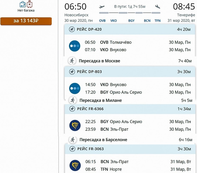 Если вы ищете один из самых дешевых вариантов полета, и время в пути не играет главной роли, могу рекомендовать рейсы лоукостеров с тремя пересадками. Например, с бюджетными компаниями «Победа» и Ryanair можно преодолеть маршрут за 32 ч. (включая стыковки во Внуково в 7,5 часа, в Милане в 5 часов и в Барселоне в 6 ч.). Зато авиабилет в одну сторону будет стоить от 13000 ₽ (с ручной кладью).
