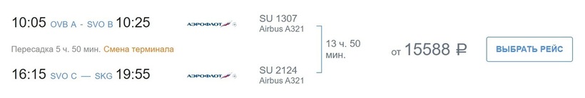 Авиарейсы с Pegas Fly и «Аэрофлотом» подойдут тем, кто не слишком торопится и желает по пути задержаться на некоторое время в Москве (например, прогуляться по Красной площади). Пересадка в столице РФ длится 9,5 ч. Прибудете в Шереметьево, второй вылет будет оттуда же. Общее время в пути — 17,5 ч. Билеты только туда — от 20500 рублей. Обратное авиапутешествие с этими компаниями обойдется примерно в такую же сумму.