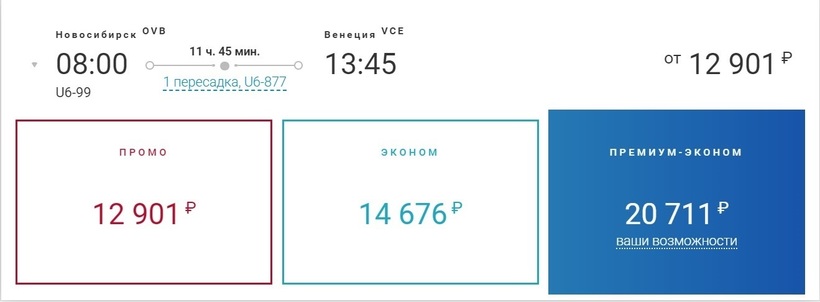 В зависимости от месяца, минимальная стоимость билета на самолет Новосибирск — Венеция в одну сторону («туда») колеблется от 14 479 (в ноябре) до 33 180 рублей (в мае) , максимальная может доходить до 41 726 рублей, а в среднем купить билет можно за 21 392 – 23 644 рубля.