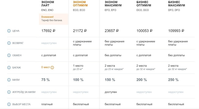 Самый дешевый тариф называется «Промо». По его условиям с собой можно взять ручную кладь (до 5 кг) и сдать в багаж чемодан (до 10 кг). Билет невозвратный. Тариф «Эконом» дороже на 20%, но уже позволяет сдать в багаж сумку, ограничение по весу которой будет 23 кг. Плюс разрешен возврат билета со штрафом. Самый продвинутый тариф — «Премиум Эконом». Его преимущества: