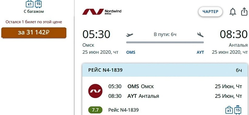 Самолеты авиакомпании Nordwind летают по маршруту с конца апреля по ноябрь по вторникам и четвергам. Путешествие с этим оператором довольно дорогое: только туда стоит в среднем 28500–32500 ₽, в обе стороны — от 47500 ₽.
