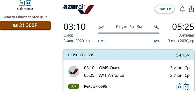 Azur Air (ZF 3383) Boeing 757-200 | 02:30 Омск (OMS) | 5 ч. 45 мин | 05:15 Анталия (AYT) | 5 октября |