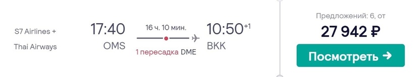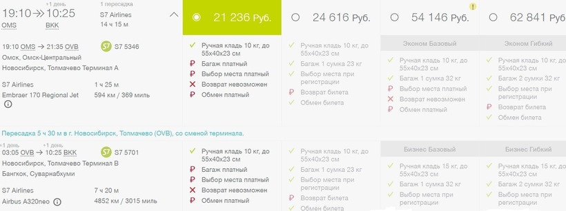 В отличие от «Аэрофлота» у S7 есть безбагажный тариф и называется он «Базовый». С собой можно взять только ручную кладь (до 10 кг). Выбор места — платный, возврат билета невозможен. Второй тариф в линейке эконома — «Гибкий» уже с багажом (до 23 кг). Возврат билета разрешен со штрафом. Да и доступен этот вариант перелета только три раза в неделю. Еще два раза в неделю за такие же деньги можно долететь в Бангкок также через Новосибирск, но время стыковки будет увеличено до 14 часов. На дорогу в итоге уйдет около суток. Также у S7 и Thai Airways есть совместный рейс через Москву (аэропорт Домодедово). Общее время в пути — 16 часов. Стыковка — 3,5 часа. Билеты — от 28000 рублей (за неделю).