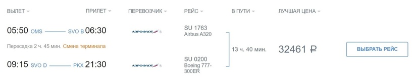 Между Омском и столицей Китая прямого авиасообщения нет. Одним из способов добраться до места назначения является перелет с самой известной и крупной российской авиакомпанией «Аэрофлот». Продолжительность оптимальных транзитных рейсов — 13,5 ч. Из этого времени на стыковку в аэропорту столицы РФ Шереметьево уйдет 2,5 часа. Всегда требуется смена терминала. Разобраться в схеме аэровокзального комплекса несложно, везде есть указатели. Стоимость перелета по маршруту Омск — Москва — Пекин составляет 32400 рублей. Это минимальная цена, которую предлагает перевозчик за три месяца до вылета.