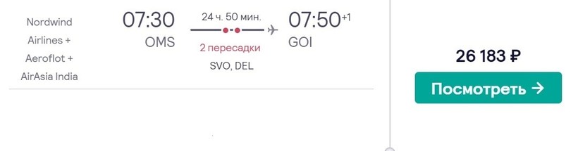 Конечно, в отсутствие прямых перелетов, максимально удобно летать с как можно меньшим количеством стыковок и без смены аэропортов при пересадках. Поэтому я выбрала полет с двумя стыковками с а/к Nordwind Airlines, «Аэрофлот», AirAsia India. Данные авиаоператоры предлагают один из максимально комфортных транзитных перелетов из Омска в Гоа. Плюс у авиакомпаний вполне удобное расписание. Отправление утром, прибытие в это же время суток на следующий день. Между российским городом и индийским штатом есть несущественная разница во времени — 30 минут.