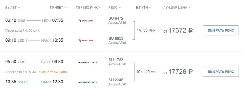 У авиакомпании много вариантов транзитных рейсов по маршруту Омск — Гамбург. Минимальное время в пути вполне приемлемое — 8 часов, максимальное — сутки с небольшим. Можете выбрать удобное время вылета/прилета и подходящее время стыковки. Для этого маршрута авиакомпания предлагает пассажирам пять тарифных планов — три в экономический класс обслуживания и два в бизнес-класс. Выбирайте авиатариф только с нужными опциями, не переплачивайте. Советую «Эконом Оптимум». Он оптимальный по цене и включенным в него услугам. Перечислю некоторые опции: