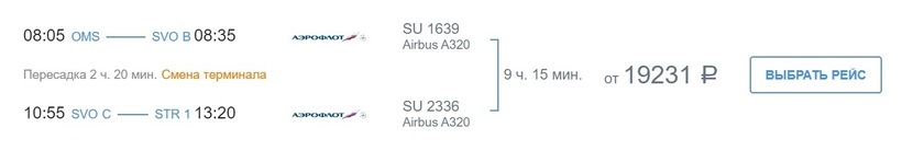 Перелет доступен ежедневно. Стыковка проходит также в Шереметьево (3 ч.), но она будет самостоятельной, так как у авиаперевозчиков нет договоренности о пересадке.