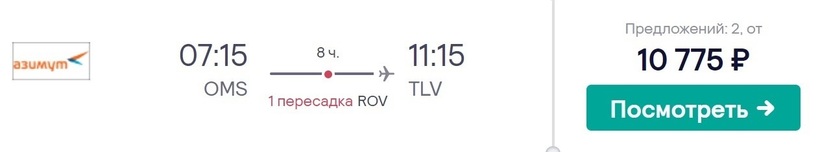 Между Тель-Авивом и Омском нет прямого авиасообщения. Один из самых быстрых транзитных рейсов предлагает «Азимут» (флот а/к представлен самолетами Sukhoi Superjet 100LR). Общее время в пути — 8 ч. На пересадку в аэропорту Ростова-на-Дону — Платов дается немногим более часа. Такой вариант перелета доступен два раза в неделю. Авиабилет за месяц до поездки можно купить за 10800 рублей. Обратный обойдется примерно в такую же сумму.