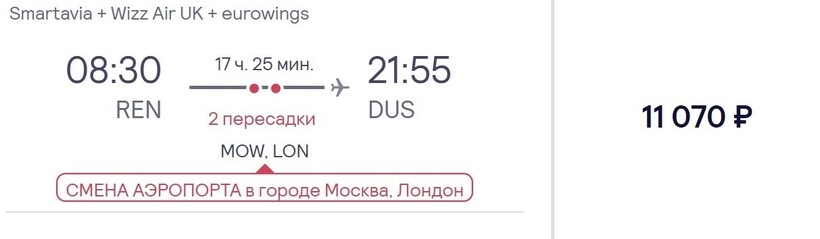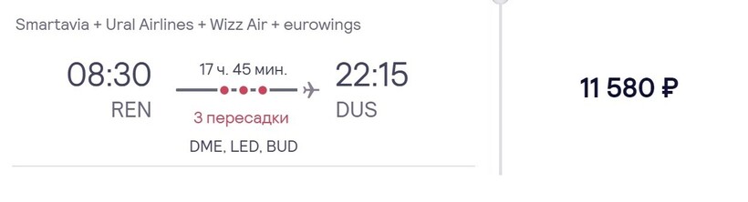 В город на западе Германии Дюссельдорф из Оренбурга можно попасть только с пересадками, прямое авиасообщение между населенными пунктами не налажено. К примеру, можете рассмотреть вариант перелета с авиакомпаниями Smartavia, Wizz Air UK, eurowings. Стоимость билетов невысокая — от 11000 рублей (за два месяца). Транзитные рейсы предполагают две самостоятельные стыковки со сменой воздушной гавани. Первая будет в Москве (из Домодедово нужно попасть во Внуково), вторая — в Лондоне (из Лутона нужно проследовать в Хитроу). Учитывая то, что на пересадки отводится немного времени (в первом случае 5,5 ч., во втором — немногим более 4-х часов), рекомендую из одного авиаузла в другой добираться на такси. Также не забывайте, что понадобится оформить транзитную визу в Великобританию. Без нее вас не выпустят из лондонского аэропорта. Выбрав этот вариант перелета, на дорогу потратите 17,5 ч.