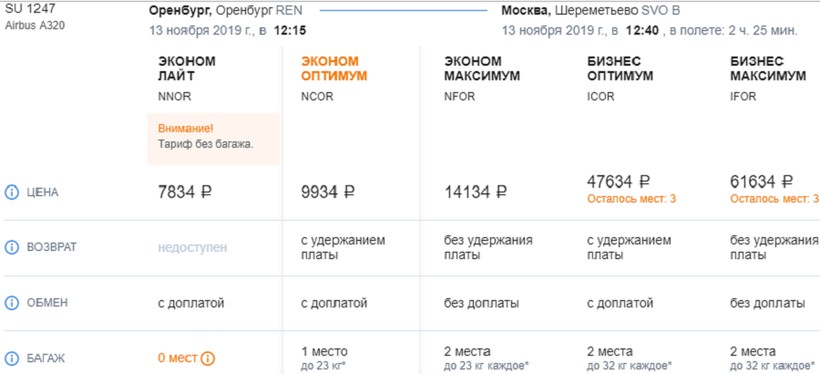 | Аэрофлот (SU 1247) Airbus А320 | 12:20 Оренбург (REN) | 2 ч. 25 мин | 12:45 Москва (SVO) | 6 ноября |