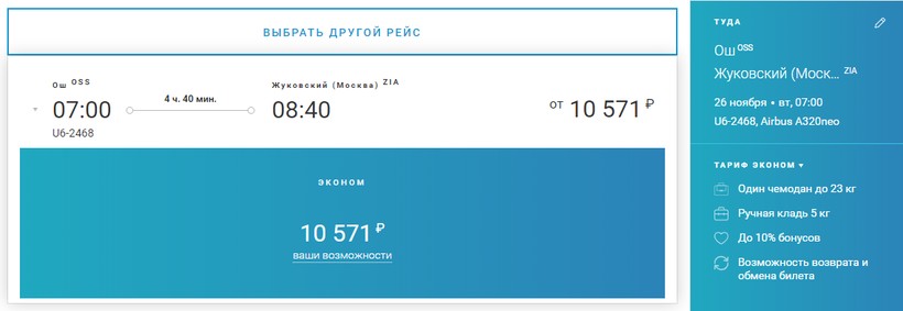| Уральские авиалинии (U6 2710) Airbus А320 | 08:40 Ош (OSS) | 4 ч. 50 мин | 10:30 Москва (DME) | 26 октября |