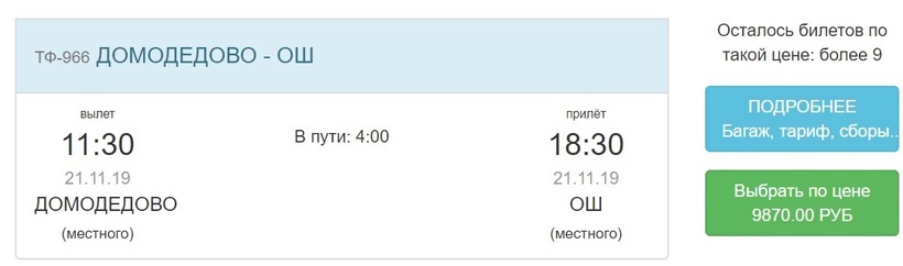 | Avia Traffic Company (YK 965) Boeing 737-300 | 08:10 Ош (OSS) | 4 ч. 35 мин | 09:45 Москва (DME) | 26, 27, 28, 29, 30 октября, 2, 3, 4, 5, 6, 9, 10, 11, 12, 13, 16, 17, 18, 19, 20 ноября, … |