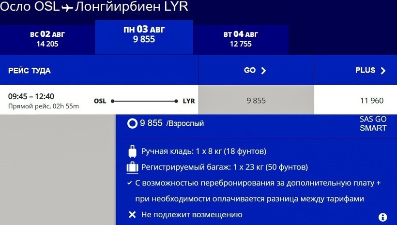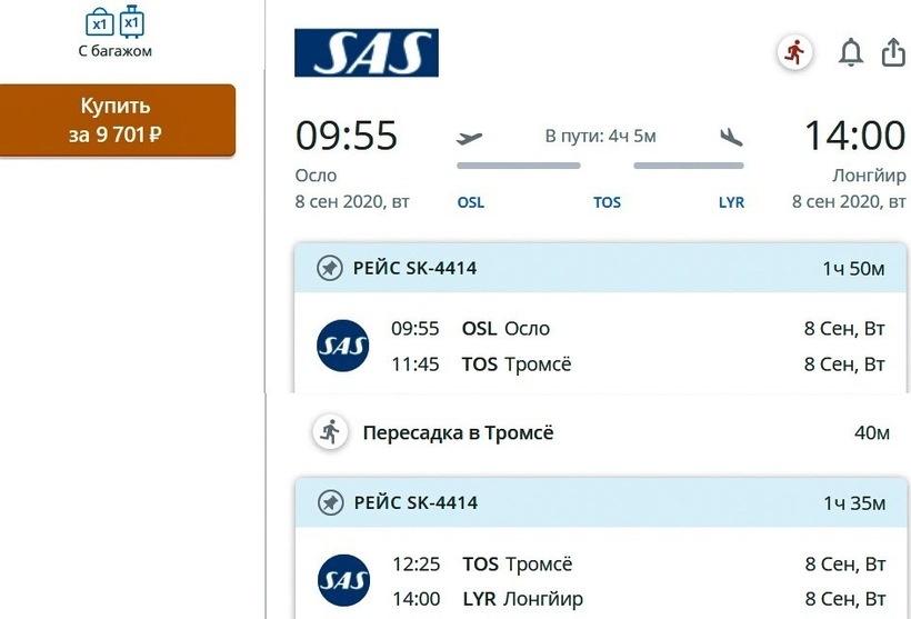 В дни, когда беспересадочные перелеты по маршруту не совершаются, могу рекомендовать стыковочные авиарейсы уже упомянутого оператора SAS. С часовой или двухчасовой пересадкой в Тромсё полет займет 4–5,5 ч. и обойдется туда в среднем в 7000–11500 ₽, туда-обратно — от 13000 ₽.