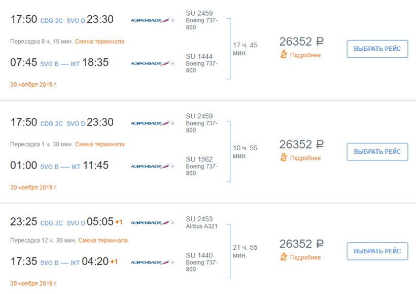 Именно он предлагает путешественникам самое удобное расписание. Каждый день из парижского аэропорта Шарль-де-Голль есть несколько вылетов, продолжительность рейсов разная. Самолеты от Парижа до Иркутска летят от 11 часов до суток.
