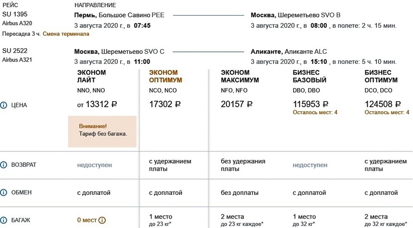 Тем, кому нужно попасть в Аликанте в осенне-зимнее время, советую отдать предпочтение полету с S7, потому что у этого оператора стоимость авиабилетов туда-обратно с багажом ниже аэрофлотовской на 5500 ₽. Я летала в Испанию летом с «Аэрофлотом», потому что путешествие с этой компанией в высокий туристический сезон дешевле — на билетах в обе стороны мне удалось сэкономить около 20000 ₽, по сравнению с S7. Но, напомню, оформить авиаперелет лучше заранее. Полет с «Аэрофлотом» следует предпочесть и любителям бизнес-класса, потому что только этот российский авиаперевозчик предлагает данный класс на протяжении всего маршрута.