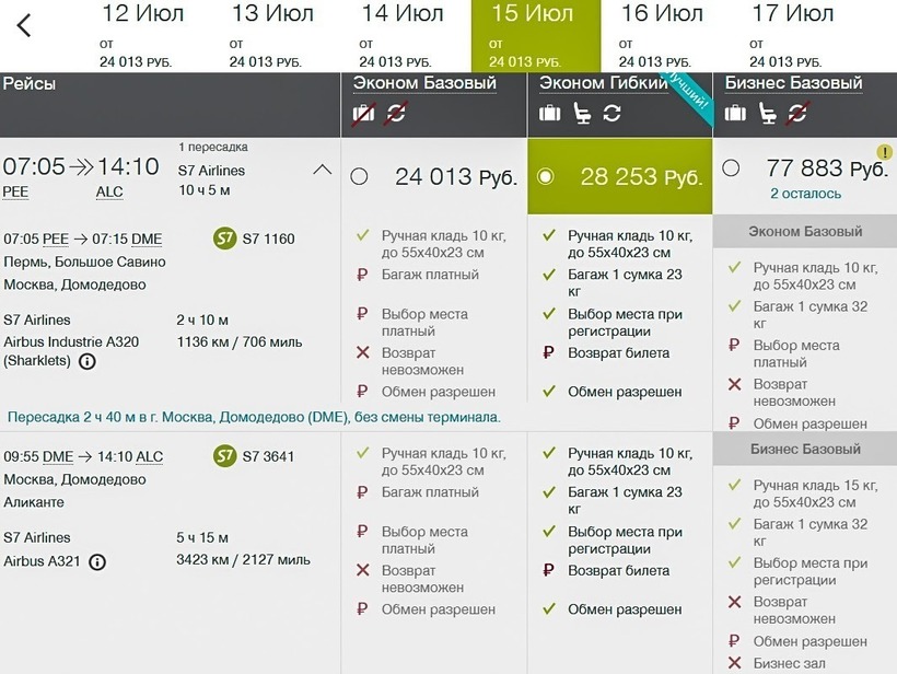 S7 Airlines немного превосходит предыдущую российскую авиакомпанию по расписанию полетов — рейсы выполняются ежедневно круглый год. По продолжительности перелета преимущества у S7 нет — со стыковкой в Домодедово в 2,5–3 часа путешествие занимает 10–10,5 ч. У этого оператора цена перелета только с ручной кладью сопоставима с аэрофлотовской: в одну сторону обойдется от 14500 ₽, туда-обратно — 19000–25000 ₽. Но к преимуществам S7 могу отнести то, что по минимальному тарифу «Базовый» билеты у компании можно изменить. Путешествие с багажом будет стоить от 17500 ₽ и 24500 ₽ соответственно. Полет в бизнес-классе S7 предлагает только из Москвы до Аликанте, а до столицы придется преодолевать путь в классе эконом. Такой перелет обойдется от 78000 ₽.