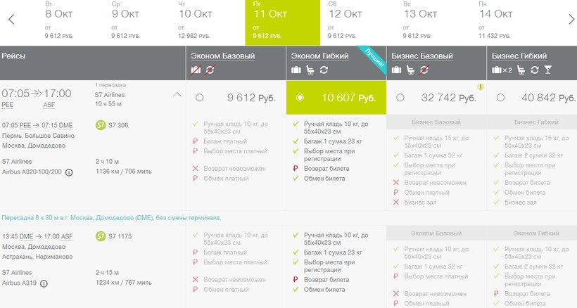 По стоимости полета в экономклассе у S7 нет преимущества перед предыдущим перевозчиком: с багажом только туда обойдется от 10500 ₽, если покупать сразу и обратный авиабилет — от 19000 ₽. Но путешествие в бизнес-классе у S7 вдвое дешевле, чем у «Аэрофлота» — стоит от 37000 ₽.