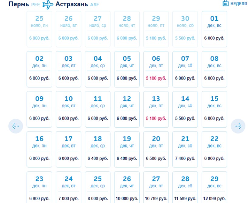 Билеты «туда-обратно» в марте обойдутся вам всего в 20 194 рубля, а в апреле придется заплатить за них не менее 31 539 рублей. В среднем же, долететь до Астрахани и вернуться в Пермь можно за 23 691 рубль.