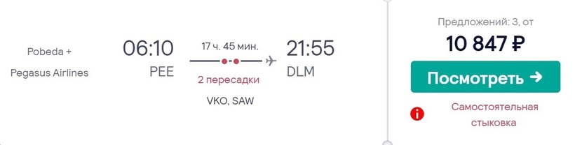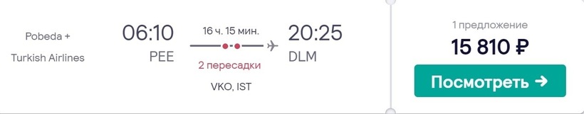 Попасть из Перми в Даламан можно минимум с двумя пересадками — прямого авиасообщения с этим турецким городом нет. «Победа» и Turkish Airlines могут доставить вас до конечного пункта за шестнадцать часов с небольшим. Первая стыковка в Москве (Внуково) — 7,5 часа, вторая в Стамбуле (Новый аэропорт) — 2 часа. Длительная пересадка в Москве — прекрасная возможность посетить, например, Красную площадь или прогуляться по Старому Арбату. Время позволяет. На дорогу на аэроэкспрессе туда-обратно уйдет 1,5 часа. За перелет с этими авиакомпаниями отдадите 15800 рублей (при условии бронирования билетов за пару недель). Если купить проездные за месяц до путешествия — можно сэкономить 10% (примерно).