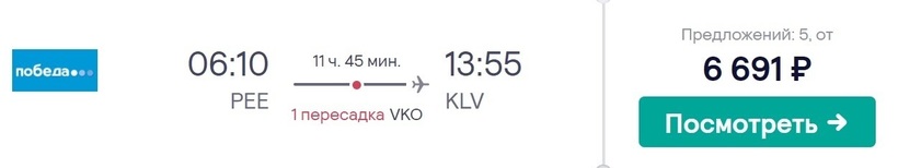 Стоимость авиабилетов на самолет Пермь — Карловы Вары в одну сторону (“туда”) колеблется от 47 286 до 52 264 рубля, в среднем купить билет можно за 49 775 рублей.