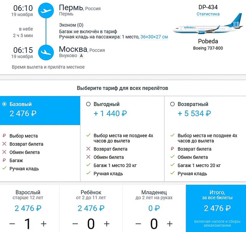 Полет с «Победой»: плюсы — дешево, минусы — маленький объем багажа и ручной клади, вылет рано утром, нельзя перенести время авиапутешествия. Подойдет для небольшой поездки без вещей.