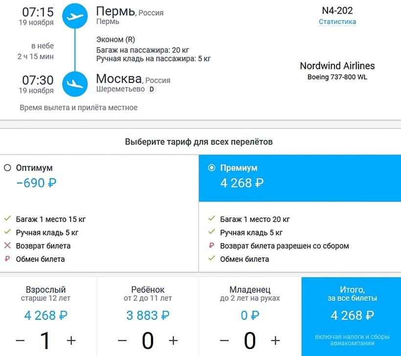 А тем, кто (как и я) пытается лететь с комфортом, но не переплачивать, рекомендую обратить внимание на рейсы Nordwind Airlines по тарифу "Премиум Эконом". Они недорогие, но с хорошей багажной нормой, питанием на борту и гибкими датами вылета.