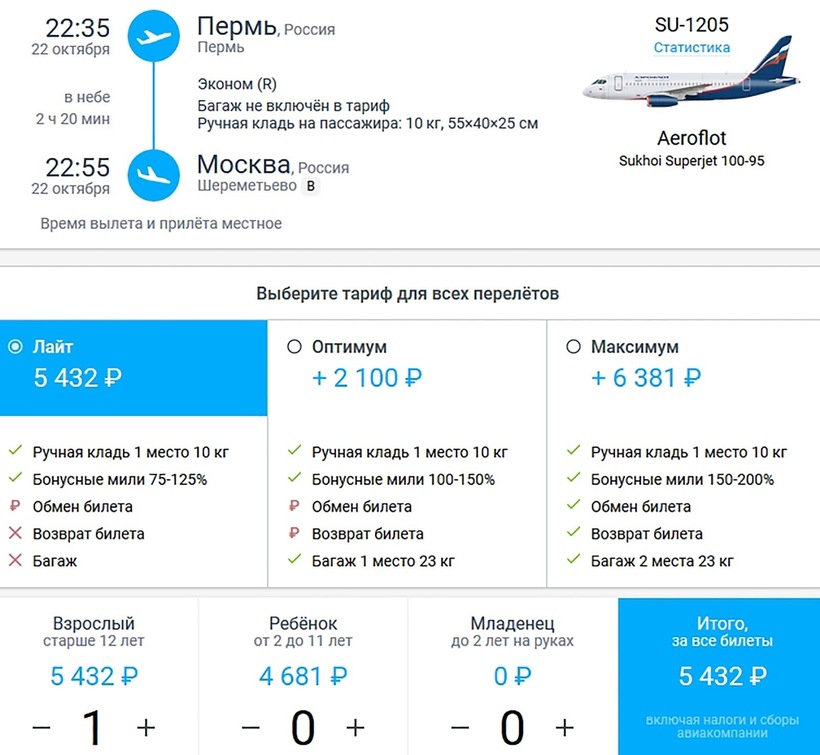 Россия (FV 6074) Сухой Суперджет 100 | 16:00 Пермь (PEE) | 2 ч. 15 мин | 16:15 Москва (SVO) | 10 октября |