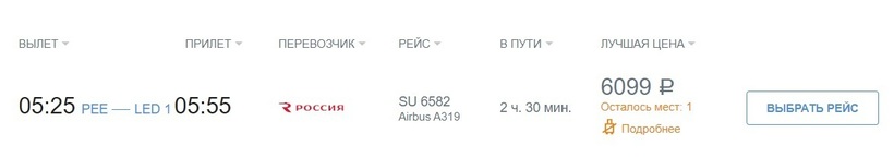 Россия (FV 6582) Airbus A320 | 06:30 Пермь (PEE) | 2 ч. 30 мин | 07:00 Санкт-Петербург (LED) | 7, 14, 21, 23, 28 марта |