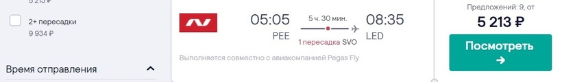 Россия (FV 6582) Сухой Суперджет 100 | 06:30 Пермь (PEE) | 2 ч. 35 мин | 07:05 Санкт-Петербург (LED) | 29 октября, 1, 8, 10, 15, 17, 22 ноября, 30 декабря, 4, 5, 11, 12 января, 2, 7, 9, 14, 16, 21, 23, 25 февраля, … |