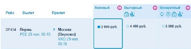 Наименее дорогой вариант перелета. К существенному минусу могу отнести самостоятельную стыковку. Вам предстоит заново проходить регистрацию во Внуково и получать/сдавать багаж. Помимо этого, у компании строгие требования к ручной клади, не откидываются спинки кресел на борту самолета и не предусмотрено питание. Самолет из Перми вылетает рано утром, рейс один, но ежедневный.