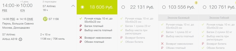 Самый быстрый вариант перелета у «Аэрофлота», который длится 16,5 часа (вместе со стыковкой) совместный с Korean Air, поэтому авиабилеты дорогие. Напомню, что их стоимость — 37300 рублей. За такое же время, только в два раза дешевле до Сеула можно долететь с S7. Единственное, пересадки придется сделать две. Но особого минуса я в этом не вижу, потому что самостоятельной стыковки они не предполагают. Плюс время ожидания следующего рейса в аэропортах пересадки недолгое.