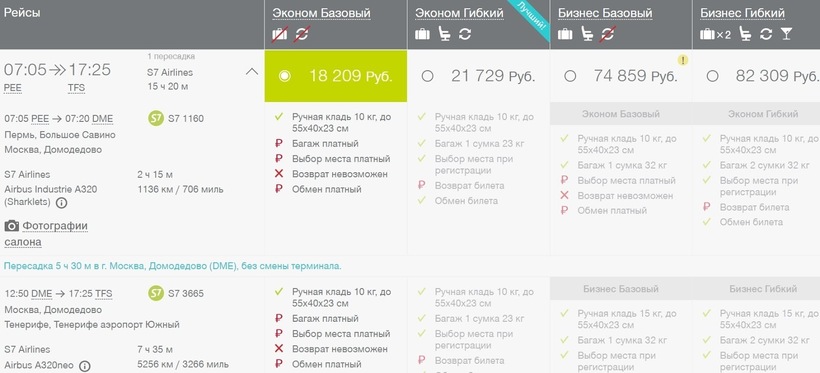 Мне удобнее всего путешествовать с одной пересадкой и одной авиакомпанией. Для перелета в Тенерифе выбрала S7, потому что билеты у этой а/к на 15 % дешевле, чем у «Аэрофлота». Единственное: пришлось подстраиваться под расписание компании. Напомню, что перелет длительностью 15,5 часов (вместе со стыковкой) доступен только раз в неделю. Также не забывайте, что S7 дает возможность частично расплачиваться за авиабилеты накопленными милями.