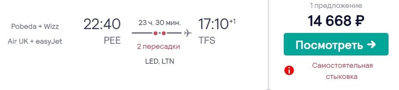 Билеты “туда-обратно” обойдутся вам в 91 811 - 101 475 рублей. В среднем же, долететь до Тенерифе и вернуться в Пермь можно за 96 643 рубля.