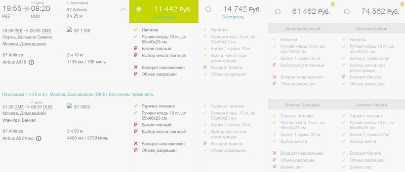 Чтобы избежать смены авиагавани в Москве, можно полететь с S7. Это не только более комфортное, но и более быстрое авиапутешествие. Дорога до места назначения займет 9,5 ч. Стыковка в аэропорту Домодедово займет 1,5 часа. Смена терминала не потребуется. Плюс летите по единому билету, минимальная стоимость которого составляет 11400 рублей (за неделю и более до поездки).