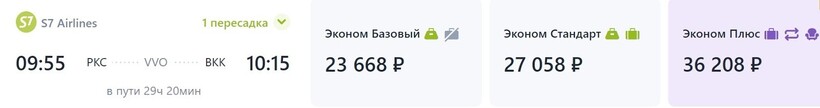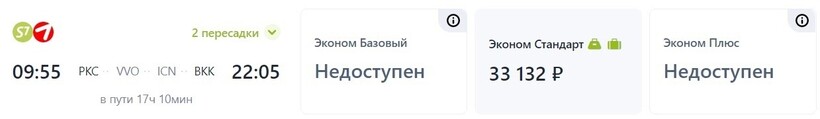 Более дешевый вариант — перелет в Бангкок с другой российской авиакомпанией — S7. Дорога до конечного пункта займет 29,5 ч. При этом, цены на билеты гораздо ниже, чем у «Аэрофлота». За перелет в одну сторону отдадите минимум 23600 рублей, при условии, что забронируете билет за 3 месяца до вылета. Минус этого варианта — длительная стыковка во Владивостоке, которая займет около 19 часов.