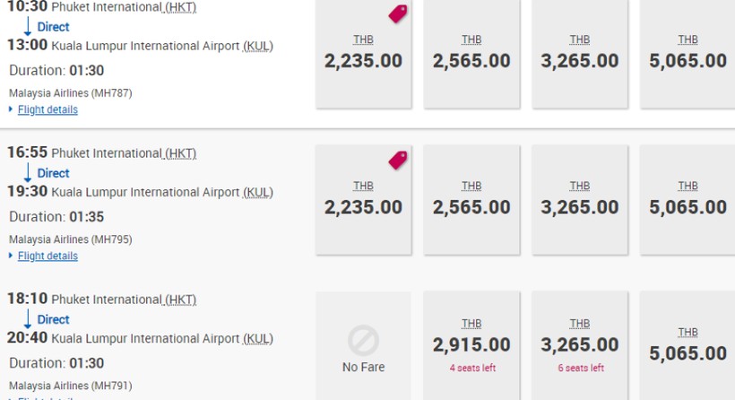 | MAS (MH 791) Boeing 737-800 | 19:40 Остров Пхукет (HKT) | 1 ч. 40 мин | 22:20 Куала-Лумпур (KUL) | пт с 03.04 |