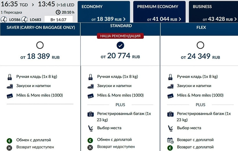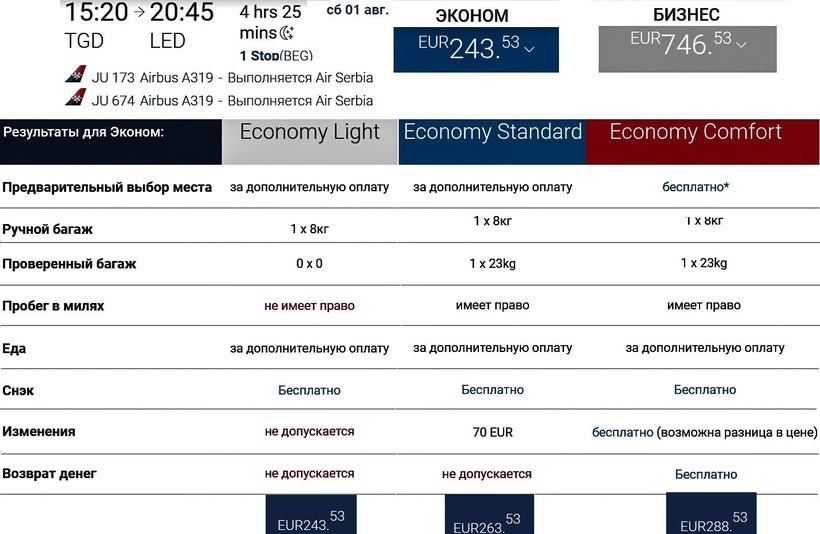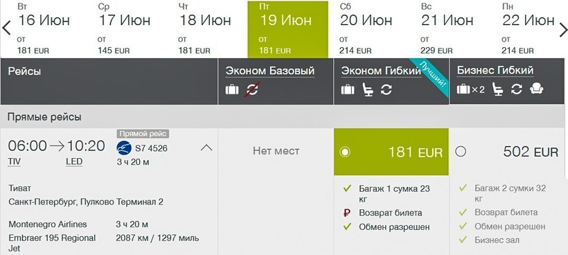 Самый дешевый вариант полета по маршруту в летний период предлагают Montenegro Airlines и Air France. Но тем, кто хочет долететь до Петербурга максимально быстро, советую путешествие с Air Serbia. В осенне-зимнее время выгоднее всего летать с турецкой авиакомпанией. Я предпочла полет из Тивата с S7. Авиабилеты только туда стоили мне дешевле на 6500 ₽, чем у польского и сербского перевозчиков, на 3500 ₽, чем у «Турецких авиалиний», и на 5500 ₽, чем у «Аэрофлота». Кроме того, даже с учетом поездки на автобусе до Тивата, по времени я сэкономила более 8,5 ч.