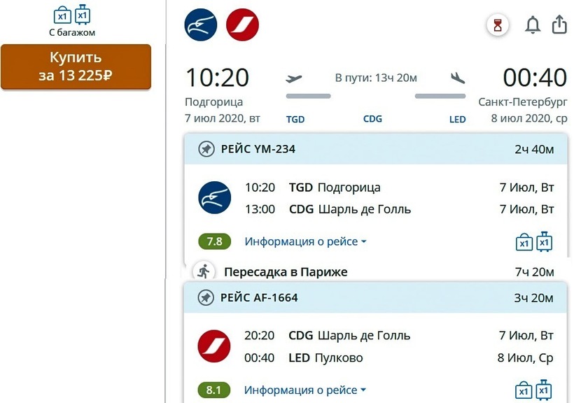 Montenegro Airlines и Air France выполняют совместные авиарейсы в апреле-мае и сентябре-октябре по вторникам, четвергам и воскресеньям, в летние месяцы — во все дни недели, за исключением понедельника. С пересадкой в Париже в 7,5–10,5 ч. путешествие длится 13,5–16,5 ч. Билеты у данных компаний недорогие: только туда можно купить с багажом за 13500 ₽, в обе стороны — от 21000 ₽. Бизнес-класс — от 64000 ₽. Рекомендую оформлять проездные заранее, потому что на многие вылеты цены выше на 7000–10000 ₽.