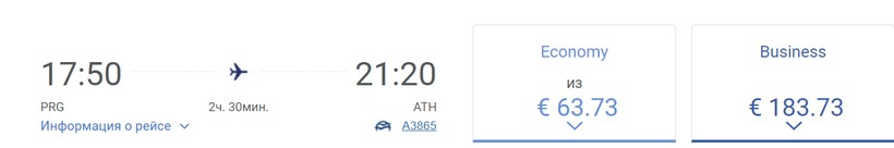 | Aegean Airlines (A3 867) Airbus А321 | 18:15 Прага (PRG) | 2 ч. 25 мин | 21:40 Афины (ATH) | 23 декабря |