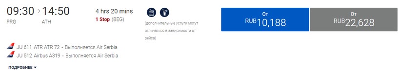 Сербский перевозчик летает из Праги в Афины транзитом через Белград. Вылеты предусмотрены по понедельникам, четвергам и воскресеньям. Рейс утренний. Время полёта составляет 4 часа 20 минут, на стыковку отводится меньше часа. Хочу сказать, что этого времени будет достаточно. Аэропорт Никола Тесла небольшой, а вам нужно будет лишь перейти из одного лайнера в другой, все остальное сделает сама авиакомпания, нет нужды проходить заново все предполетные формальности. Минимальная цена билетов составляет 10000 рублей.