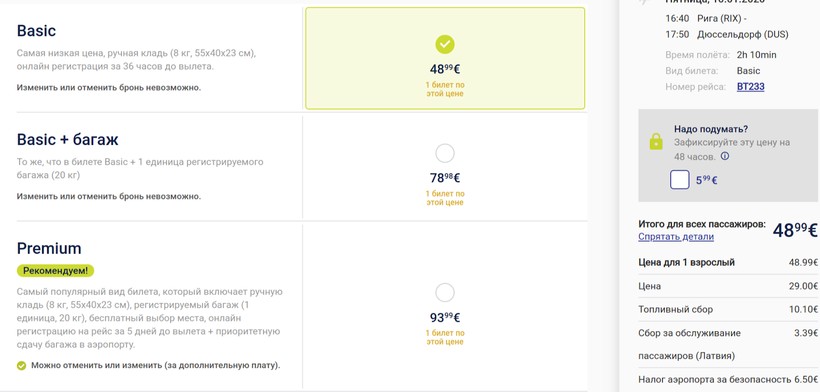 Трудно сказать, что направление пользуется популярностью среди туристов. С одного города в другой несколько раз в неделю (по понедельникам, средам, пятницам, субботам) беспересадочные авиаперелеты осуществляет только компания airBaltic. Расписание найти можете на сайте авиаоператора. Вылет происходит с единственного аэропорта Риги, где пассажиров обслуживают в трех терминалах. К воздушной гавани я всегда добираюсь на автобусе № 22, поскольку это самый дешевый вариант: стоимость проездного на общественный транспорт — 90–150 рублей, тогда как такси обходится в 900–1000 рублей. airBaltic предлагает несколько видов билетов, отличающихся между собой не только ценами, но и набором услуг. Самый бюджетный Basic обойдется от 3500 рублей в одну сторону, если покупать как минимум за 50 дней до вылета. Такая дешевизна легко объясняется — перевозить с собой можно только ручную кладь до 8 кг, если взяли с собой чемодан, придется доплачивать 2100 рублей.