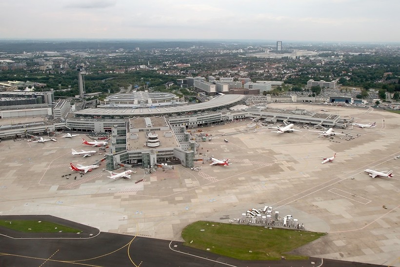 Самолеты садятся в огромном аэропорту Дюссельдорфа, где пассажиров обслуживают в трех терминалах.