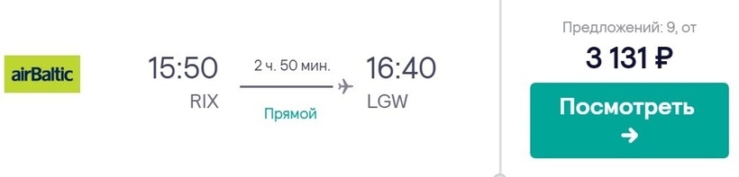 | Norwegian (D8 2118) Boeing 737-800 | 17:15 Рига (RIX) | 2 ч. 40 мин | 17:55 Лондон (LGW) | пт с 06.02 по 27.03 |