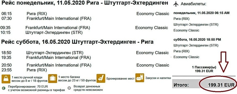 Однозначно удобнее всего лететь по маршруту на крыльях латвийской компании airBaltic, с которой преодолеть путь получится недорого и максимально быстро (напомню, прямой авиаперелет занимает всего 2 ч.). Но поскольку мне нужно было долететь до Штутгарта в день, когда беспересадочный рейс не выполнялся, я выбирала из транзитных операторов, и предпочла преодолеть расстояние между городами с Lufthansa, потому что авиабилеты туда-обратно у этой компании одни из самых дешевых. Стоимость путешествия с немецким перевозчиком сопоставима с ценами LOT, но ниже на 3000 ₽, чем у «Турецких авиалиний». Лететь с пересадкой в одну сторону я бы рекомендовала с авиакомпанией Turkish Airlines, билеты у которой дешевле на 4000 ₽, чем у LOT, и на 17500 ₽, чем у Lufthansa. Но по продолжительности полета выигрывает польский перевозчик, с которым перелет занимает на 3,5 часа меньше, чем с турецким оператором.