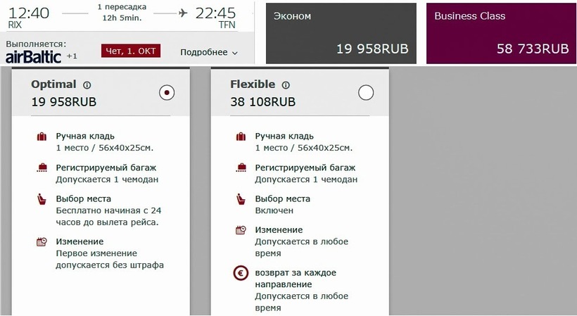 airBaltic и Iberia уступают российской компании по расписанию полетов: преодолеть путь с балтийским и испанским операторами можно только дважды в неделю — по четвергам и воскресеньям в весенне-летнее время и по понедельникам и четвергам в осенне-зимний период. С пятичасовой пересадкой в Мадриде авиапутешествие занимает 12 часов. У данных авиакомпаний есть преимущество перед «Аэрофлотом» по ценам: билет в одну сторону с багажом стоит от 20000 ₽, туда-обратно — от 40000 ₽. Тариф с ручной кладью airBaltic и Iberia не предлагают. Бизнес-класс — примерно от 59000 ₽.