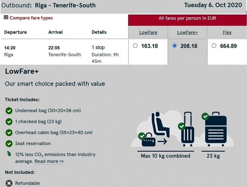 Air Baltic (BT 1761) Airbus A220-300 | 15:25 Рига (RIX) | 6 ч. 40 мин | 20:05 Тенерифе (TFS) | 18 октября |