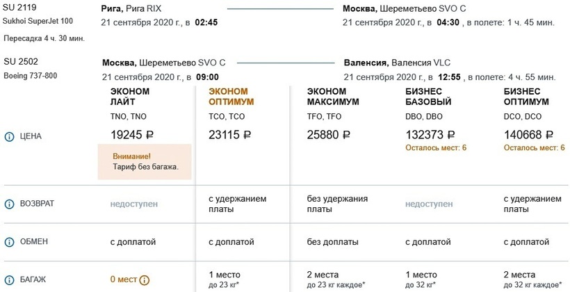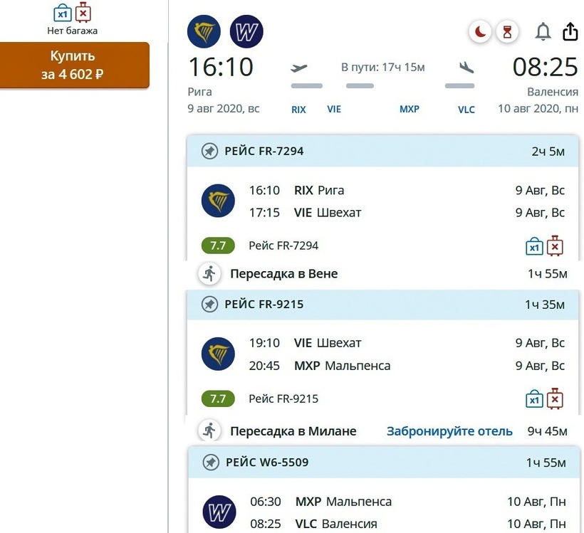Самый дешевый способ преодолеть путь — полет с самостоятельными стыковками с лоукостерами. Например, долететь в Валенсию можно с Ryanair и Wizz Air за 17 часов с пересадками в Вене и Милане (длительностью 2 и 10 ч.), билет туда с ручной кладью купите всего за 4500 ₽.